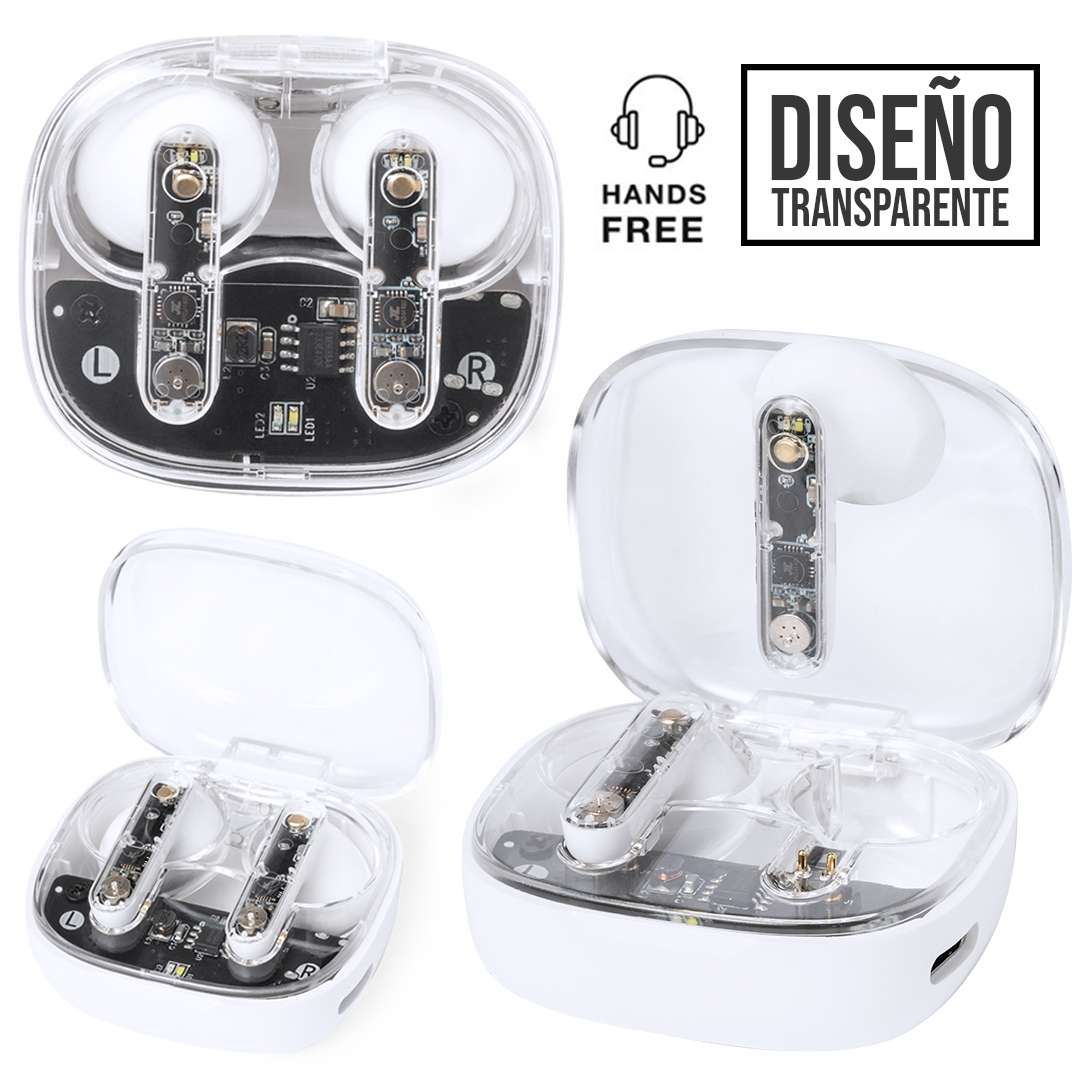 Auriculares intraurales en distintivo diseño transparente. Conexión Bluetooth® 5.3 y gran autonomía . De diseño ergonómico, incluyen botón de control táctil integrado en el auricular, con base de carga a juego e indicadores de estado de carga. Función manos libres. Puerto de carga con entrada Tipo C (cable incluido). Presentados en caja individual de diseño kraft y en bolsa reciclada. Conexión Bluetooth. Batería 30 mAh/ Base Carga 200 mAh