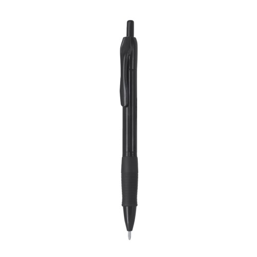 Bolígrafo de mecanismo pulsador y empuñadura disponible acabado gomoso. Fabricado en ABS de tinta negra.
