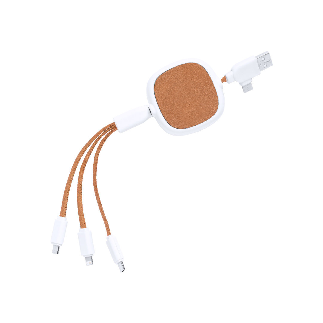 Cable cargador extensible de 1 m, fabricado en RABS y en elegante color blanco, con cables y detalles en cuero reciclado.Pieza central con cubierta en cuero reciclado y mecanismo interior que convierte al cable en extensible. Con conexiones de entrada Tipo C y USB y salidas Tipo C,Lightning y Micro USB. 5V DC 2.4AEl material RABS o ABS Reciclado y el cuero reciclado proceden del reciclado de artículos al final de su vida útil. Los materiales reciclados empleados incorporan la certificación RCS, que garantiza el origen reciclado de los mismos. Cable Extensible. Conexión Micro USB, Tipo C y Lightning 5V DC 2.4A