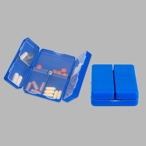 Pastillero semanal "CARE" de Polipropileno (PP). Cuenta con 7 compartimentos interiores de PVC translúcido y apertura doble tipo "libro", con cierre interior imantado. Presentación el bolsa OPP + caja de cartulina blanca.