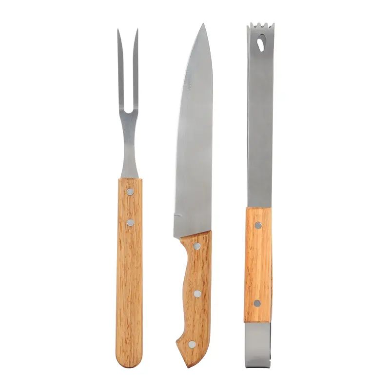 Set de asado con cuchillo, tenedor y pinza. Fabricado en madera de hevea y acero inoxidable 420. Contiene cuchillo, tenedor trinchador , pinza para asado y bolsa de guardado de nylon. Es ideal para manipular cortes de carne con precisión y comodidad durante la parrilla o asados al aire libre.