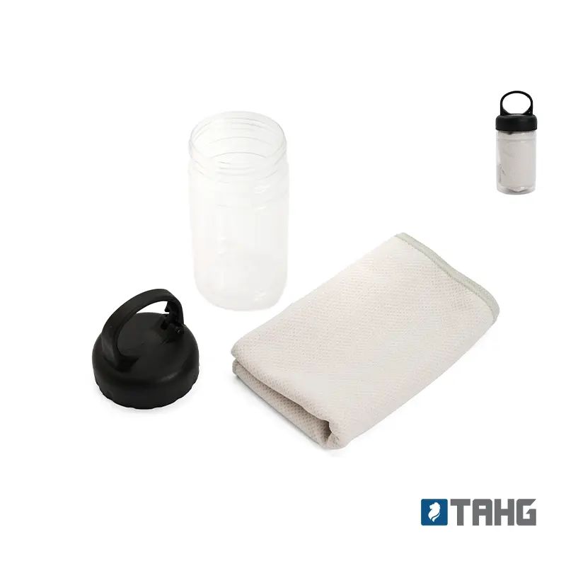 Toalla con estuche portátil. Fabricada en poliéster, PET y polipropileno. Cuenta con toalla de secado rápido (30 × 80 cm) y envase plástico con gancho incorporado para colgar o transportar fácilmente. Es ideal para entrenamientos, actividades al aire libre o viajes, gracias a su tamaño compacto y capacidad de secado rápido. Tahg.