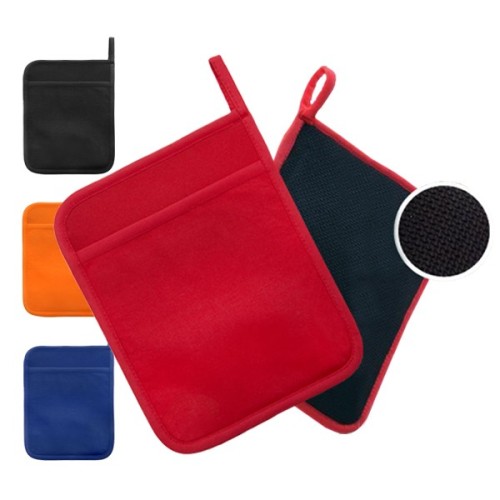 Agarrador de cocina en alta calidad en combinación de materiales neopreno y poliéster de variada gama en vivos colores. Con una cara lisa especialmente diseñada para impresión y cinta para colgar. Una Cara Lisa para Impresión