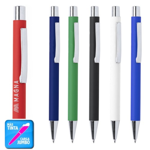 Original bolígrafo de mecanismo pulsador en elegante diseño bicolor. Con cuerpo de aluminio en tacto goma de acabado mate. Especialmente diseñado para marcaje en láser y mostrar el logotipo en tono plateado. Clip, parte superior y punta en plateado. Disponible en variada gama de colores, con cartucho jumbo y tinta azul. Carga Jumbo