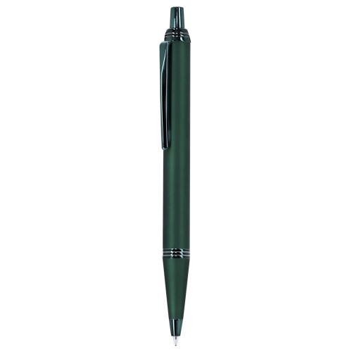 Bolígrafo con cuerpo en aluminio, acabado gomoso y detalles cromados. De mecanismo pulsador, con cartucho jumbo y tinta azul. Carga Jumbo
