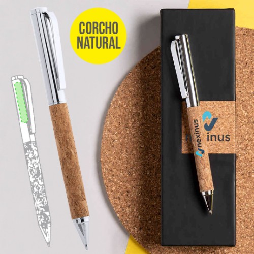 Bolígrafo de línea nature con cuerpo en corcho natural. Clip, punta y parte superior metálicos, con acabado cromado. De mecanismo giratorio, cartucho jumbo y con tinta azul. En estuche individual de polipiel con detalle en corcho e interior en suave antelina. Presentado en estuche de cartón negro.