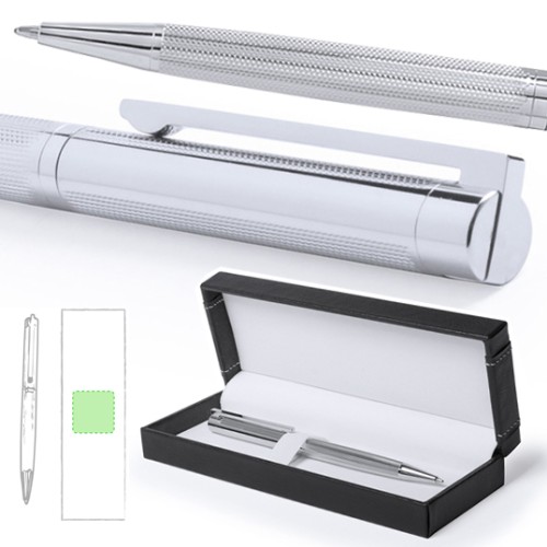 Elegante bolígrafo de mecanismo giratorio en sobrio diseño. De cuerpo metálico antideslizante en acabado plateado brillante con clip a juego. Presentado en elegante estuche individual de polipiel en color negro con interior en suave antelina blanca. En tinta azul de calidad alemana. Carga Jumbo